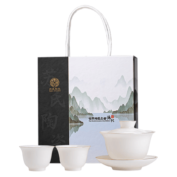 苏氏陶瓷三才盖碗手绘青花陶瓷薄胎功夫泡茶碗带两个茶杯礼盒装